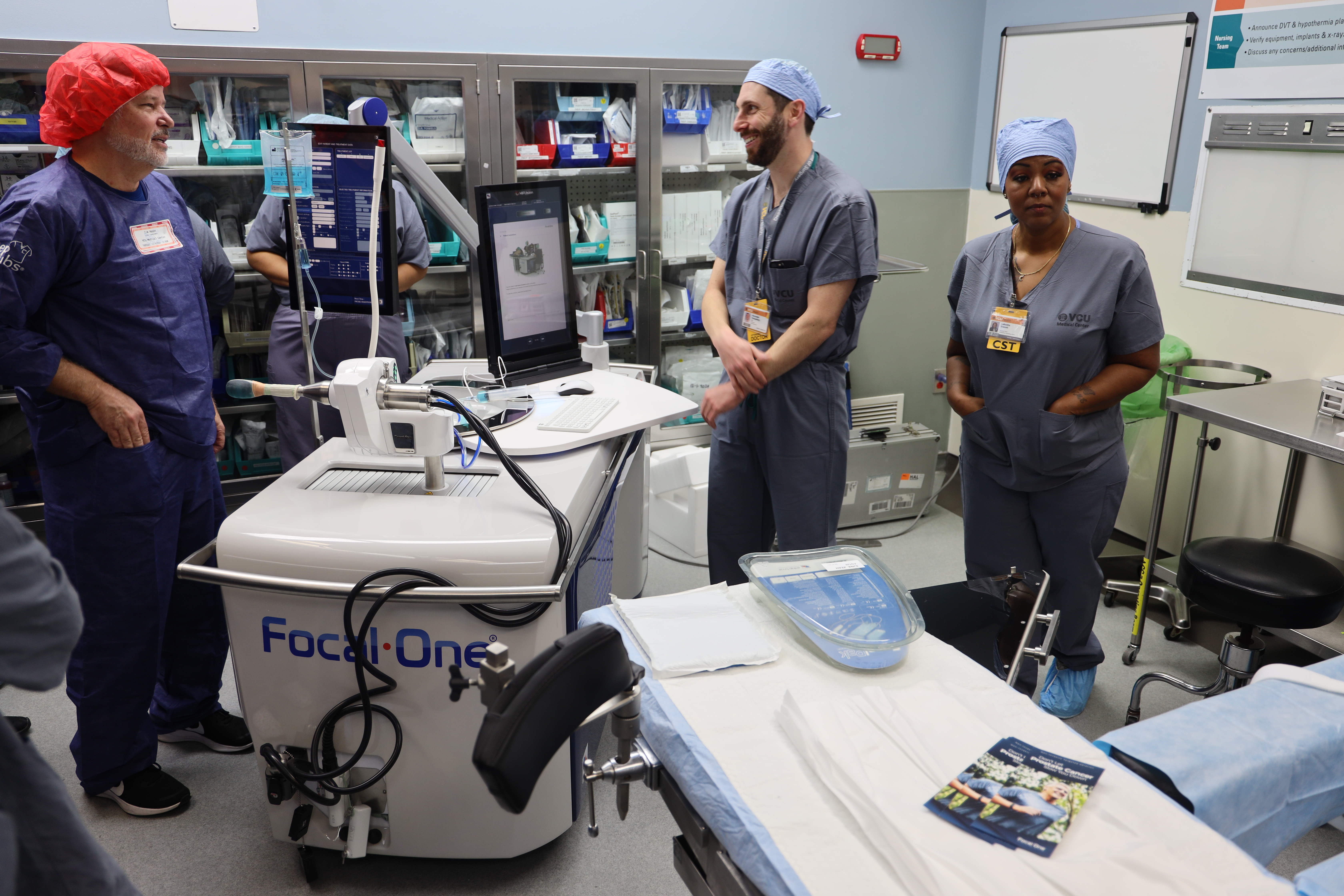 VCU Massey prostate clinical care team pictured during a hands-on HIFU training session. This non-surgical technology focuses high-intensity ultrasound waves on the affected prostate tissue only, leaving healthy tissue unharmed. Massey is one of the first along the Atlantic Coast to offer the cutting-edge Focal One Robotic HIFU technology.