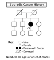 The word sporadic means “to occur by chance.” Families who have a single person with cancer at an older age are usually classified as “sporadic.” In other words, there is not an inherited pattern of cancer present, and often only one or two individuals in the family have cancer at a typical age of onset. Relatives are usually not at increased risk of developing cancer. Genetic testing is usually not beneficial in these families.