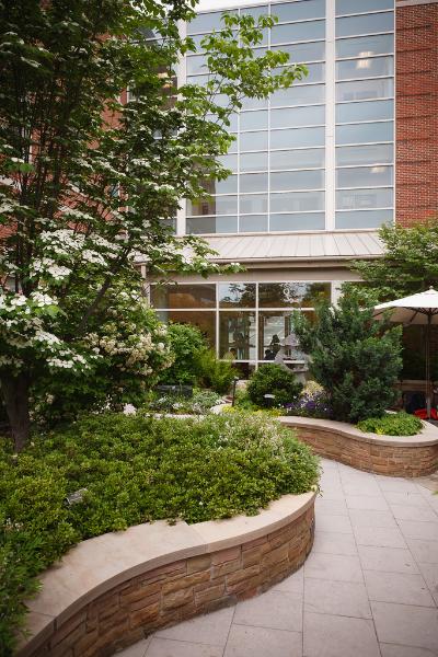 The restorative power of gardens is an ancient idea that still has therapeutic power. The Healing Garden is growing shade trees, perennials, evergreens, shrubs, vines and groundcovers. Water sculptures and a tranquil pool add to the atmosphere. Views from the garden are framed by bronze screens that borrow design elements such as birds and reeds from the nearby Egyptian Building, which was the original medical school built in 1845.